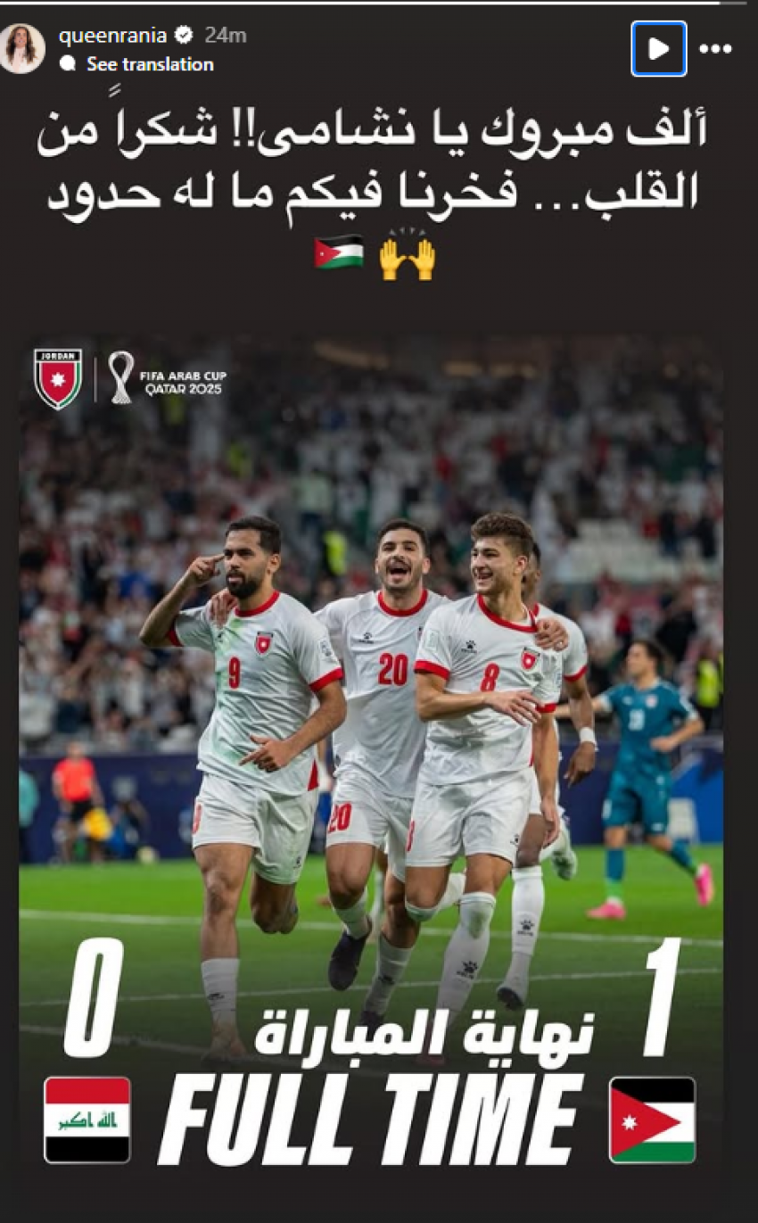 القلعة نيوز- هنأت جلالة الملكة رانيا العبدالله، الجمعة، المنتخب الوطني لكرة القدم بعد تأهله إلى نصف نهائي كأس العرب 2025، إثر فوزه على نظيره العراقي بهدف دون رد.