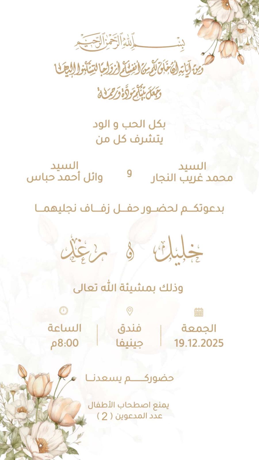 مدير مجموعة القلعة نيوز الاعلامية قاسم الحجايا يهنى أ.د.فائق فراج بزواج ابن اخته وهو السيد محمد غريب نجار و السيد وائل احمد حباس بكل حب و ود بزفاف نجليهما خليل و رعد مع كل الحب و التوفيق والف الف مبروك حفل الزفاف .