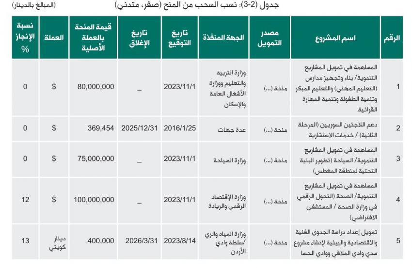 وبحسب التقرير انخفضت المنح الخارجية الفعلية لسنة 2024 بمبلغ 19 مليون دينار بنسبة 2.6% كنتيجة لانخفاض تلك المنح ومنح أخرى بمبلغ 64 مليون دينار، مقابل الحصول على منح بمبلغ 45 مليون دينار.