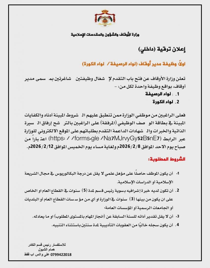 القلعة نيوز - أعلنت وزارة الاوقاف والشؤون والمقدسات الإسلامية اليوم الاحد فتح باب التقدم، إلى وظائف غدارية عليا تشمل مدراء أوقاف ومساعدين للأمناء العامين.