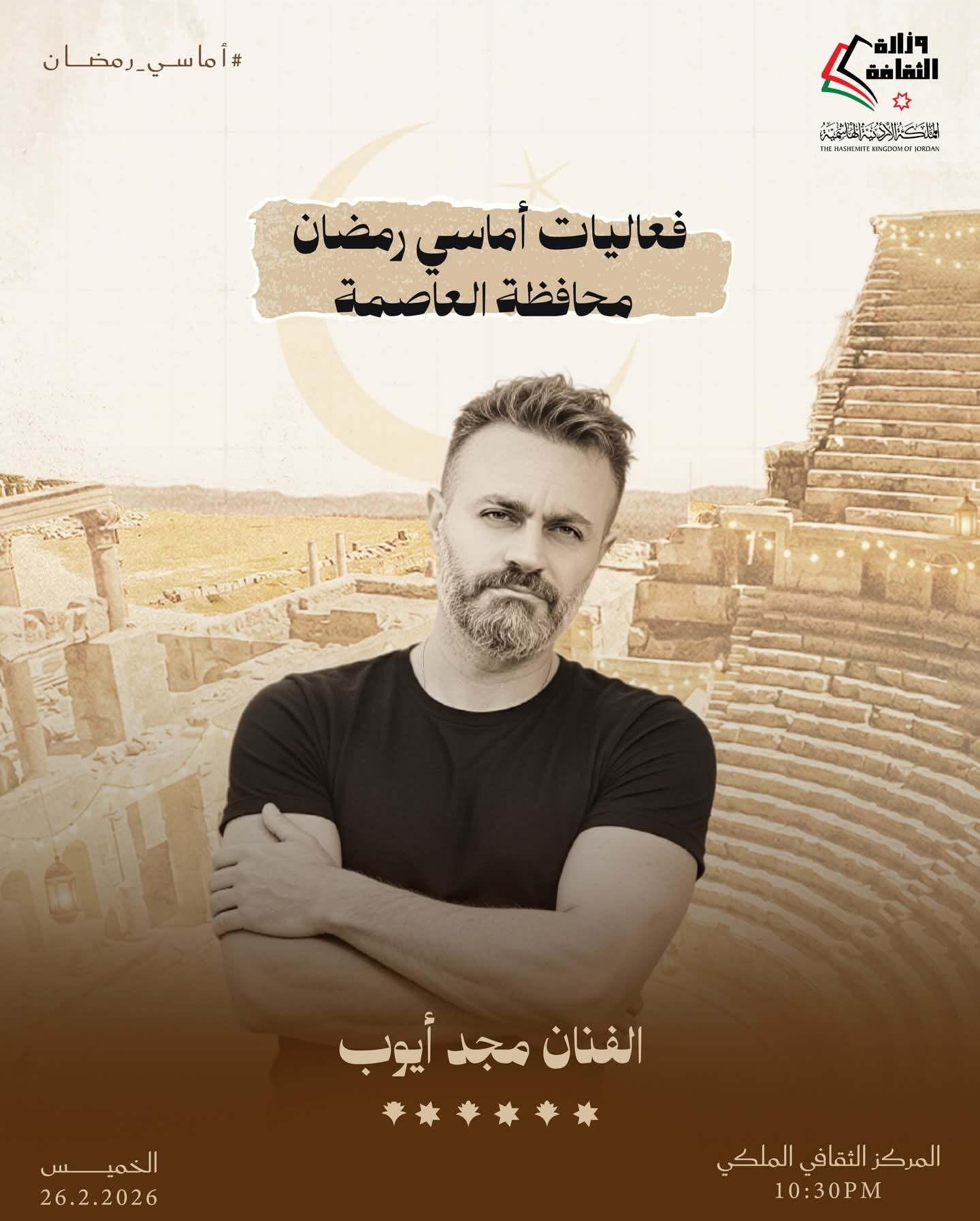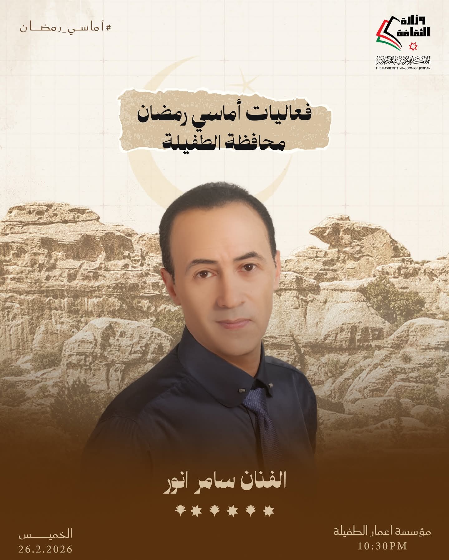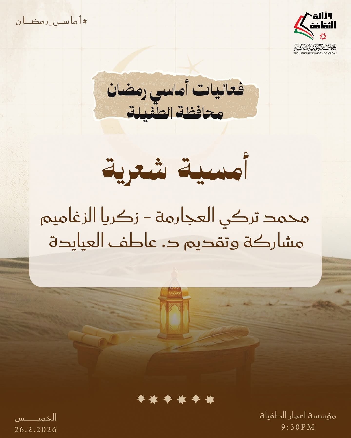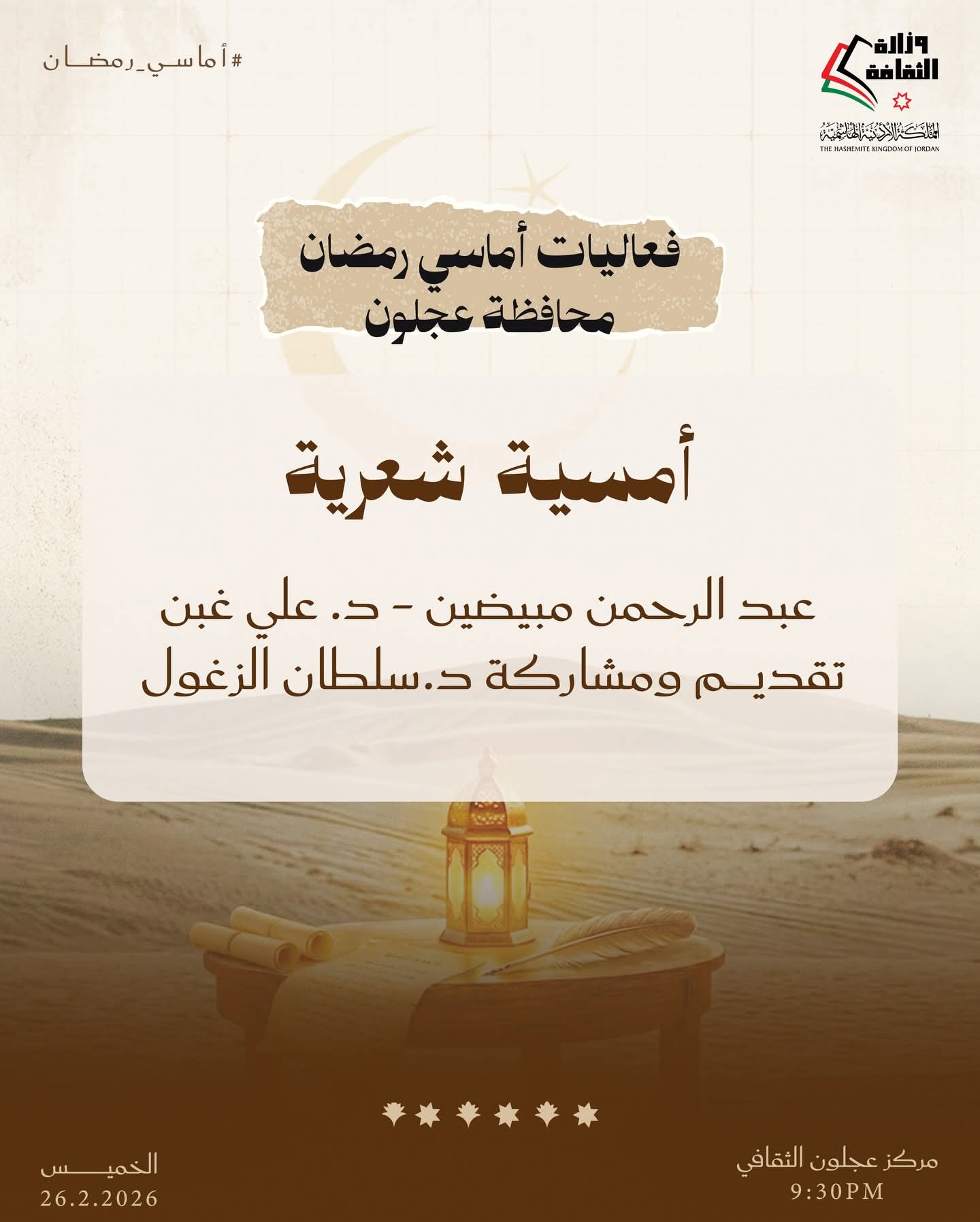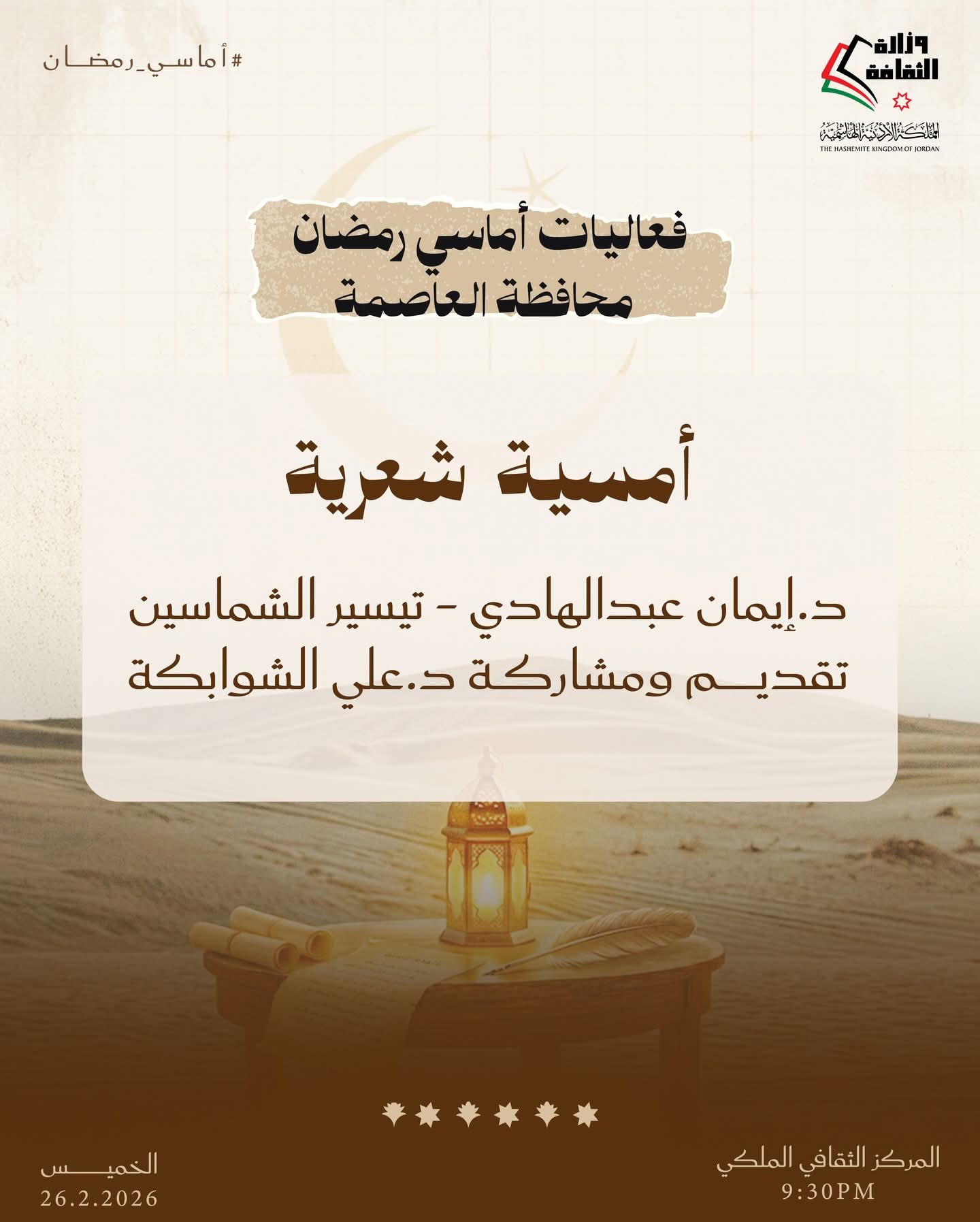 القلعة نيوز- تواصل وزارة الثقافة تنفيذ برنامج «أماسي رمضان» من خلال حزمة فعاليات ثقافية وفنية تقام مساء الخميس المقبل في عدد من محافظات المملكة، انسجامًا مع ما يحمله الشهر الفضيل من قيم روحية واجتماعية، وذلك في المراكز الثقافية بالمحافظات من الساعة التاسعة والنصف مساءً وحتى الثانية عشرة ليلًا.