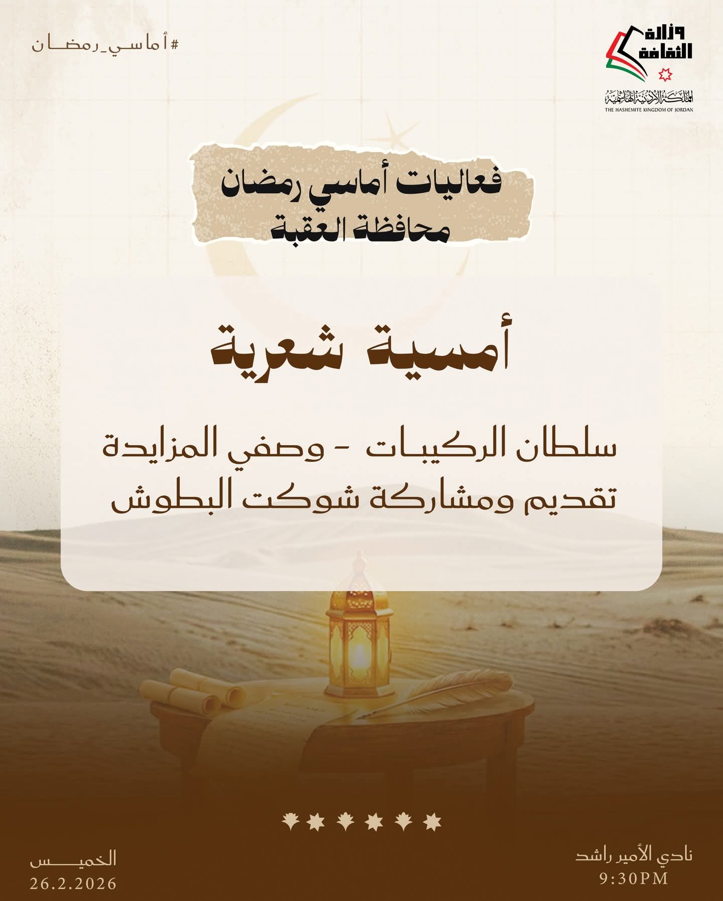 وفي محافظة العقبة، تقام أمسية شعرية عند الساعة التاسعة والنصف مساءً في نادي الأمير راشد، يحييها الشاعران سلطان الركيبات وصفي المزيدة، ويقدمها ويشارك فيها شوكت البطوش.