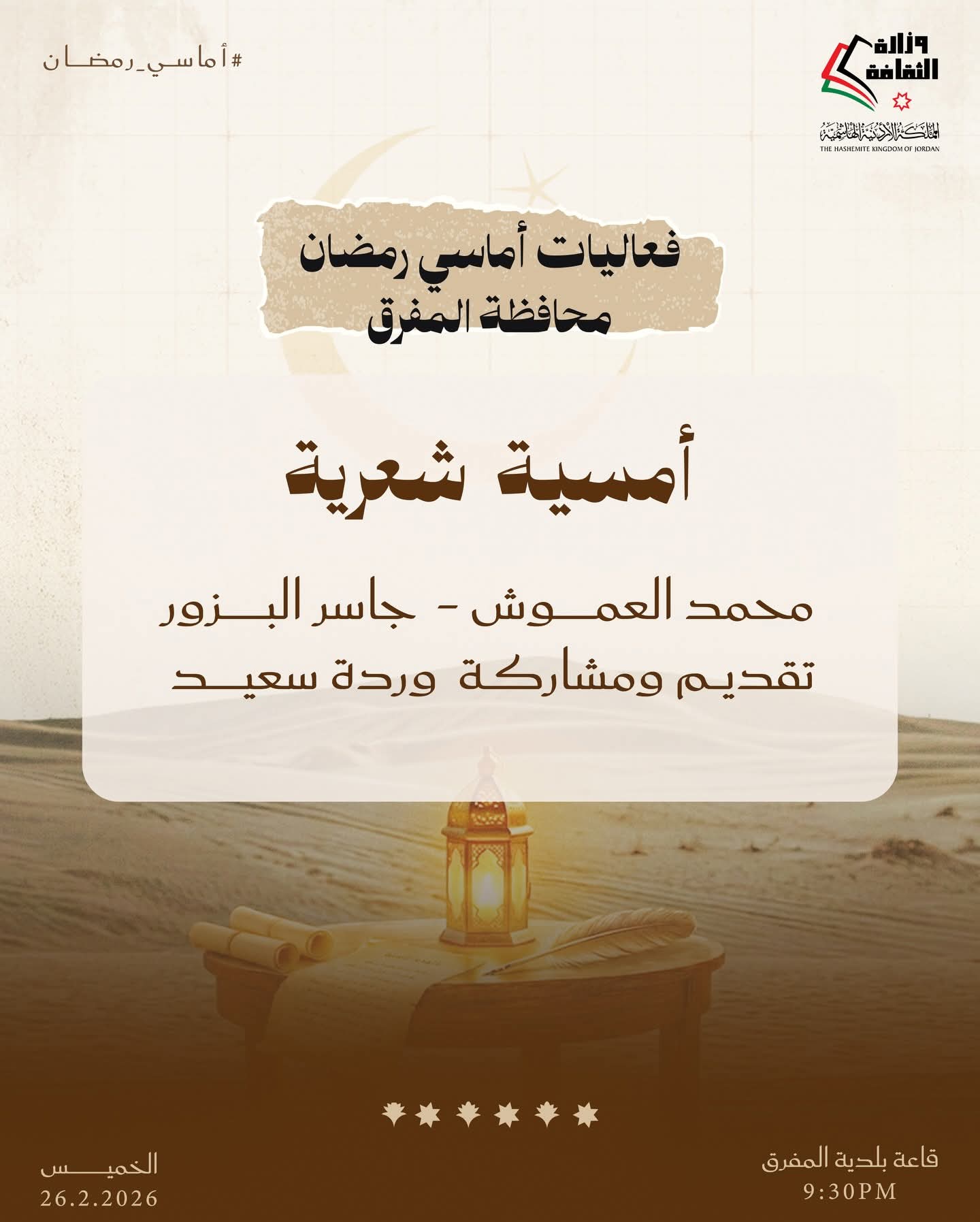 ويأتي البرنامج ضمن توجه الوزارة إلى توزيع الفعاليات الثقافية على مختلف المحافظات، بما يتيح للجمهور المشاركة في أنشطة رمضانية تعزز حضور الثقافة في الحياة العامة.