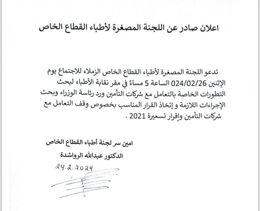 لجنة اطباء القطاع الخاص تصعد وتدعو إلى اجتماع طارئ لاتخاذ قرار بوقف التعامل مع شركات التامين