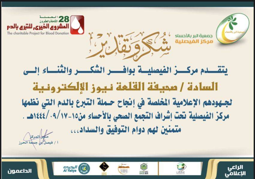 السعودية _ الأحساء _ مركز الفيصلية يشكر موقع القلعة نيوز على إنجاح حملة التبرع بالدم