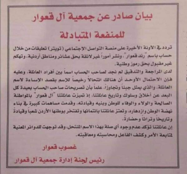 بيان صادر عن آل قعوار حول المدعوة “رند قعوار”