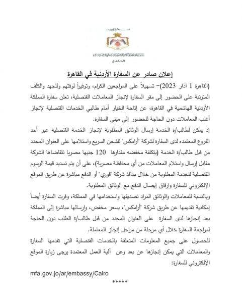 إعلان صادر عن السفارة الأردنية في القاهرة