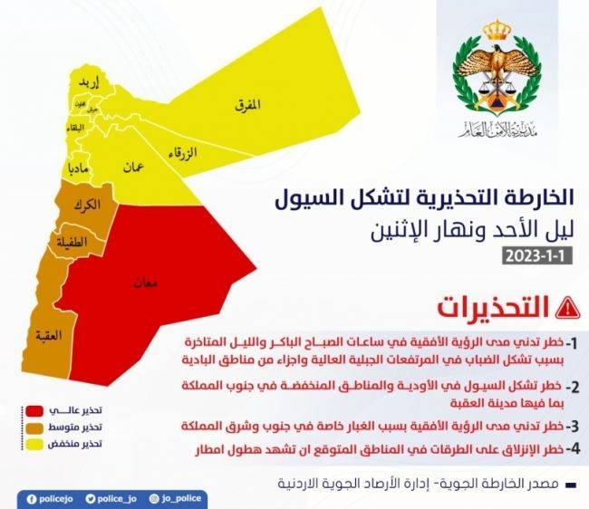مديرية الأمن العام تحذر من حالة عدم الاستقرار الجوي المتوقعة