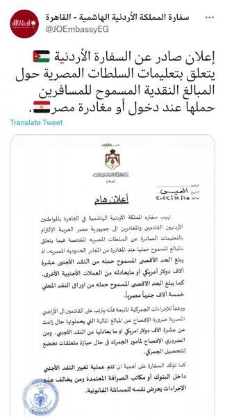 السفارة الأردنية في القاهرة توضح تعليمات المبالغ المسموح للمسافر حملها