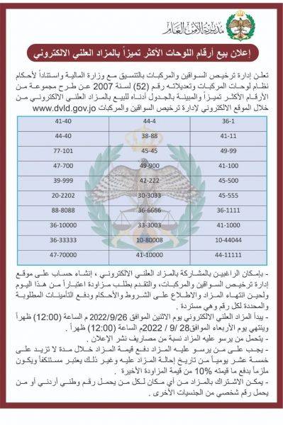 الأمن العام: مزاد علني لبيع أرقام لوحات المركبات