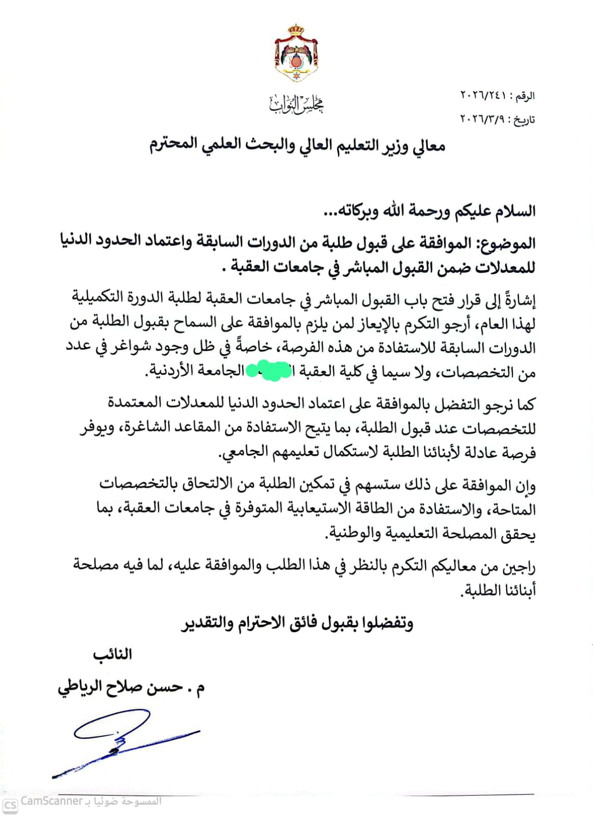 النائب الرياطي يطالب وزير التعليم العالي الموافقة على قبول طلبة من الدورات السابقة واعتماد الحدود الدنيا للمعدلات ضمن القبول المباشر في جامعات العقبة .