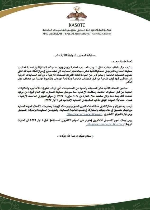 مركز الملك عبدالله الثاني لتدريب العمليات الخاصة يدعو وسائل الإعلام للمشاركة في تغطية فعاليات مسابقة المحارب الدولية في نسختها الثانية عشر