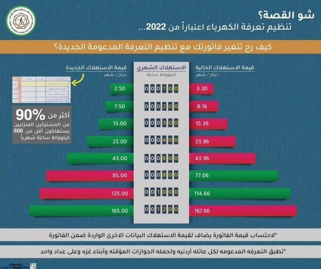 التعرفة الكهربائية الجديده للمشتركين المنزليين لن تحدث تغييرا يذكر في الفواتير الشهرية ل ( 90 % )من الاردنيين في القطاع المنزلي