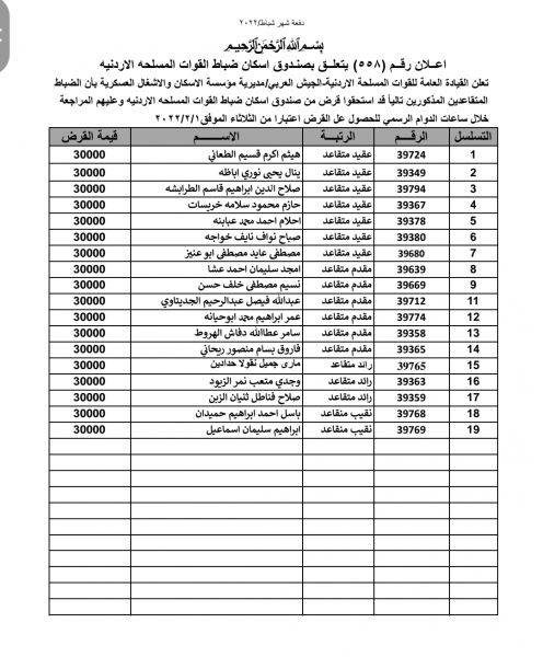 إعلان صادر عن القيادة العامة للقوات المسلحة الأردنية - الجيش العربي / مديرية مؤسسة الإسكان والأشغال العسكرية 31/01/2022