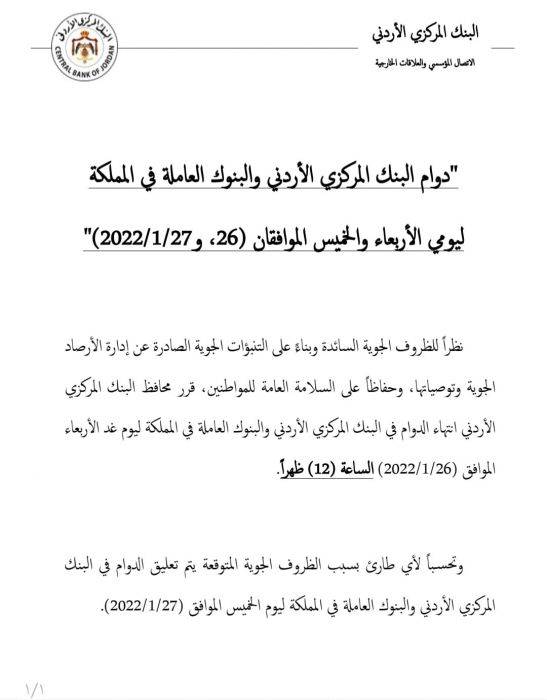 المركزي يعطل البنوك الخميس ويعلق الدوام الاربعاء عند الساعة الـ12 ظهرا