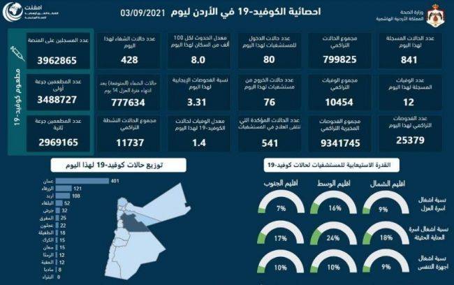 عاجل : 12 وفاة و841 إصابة جديدة بفيروس كورونا في الاردن