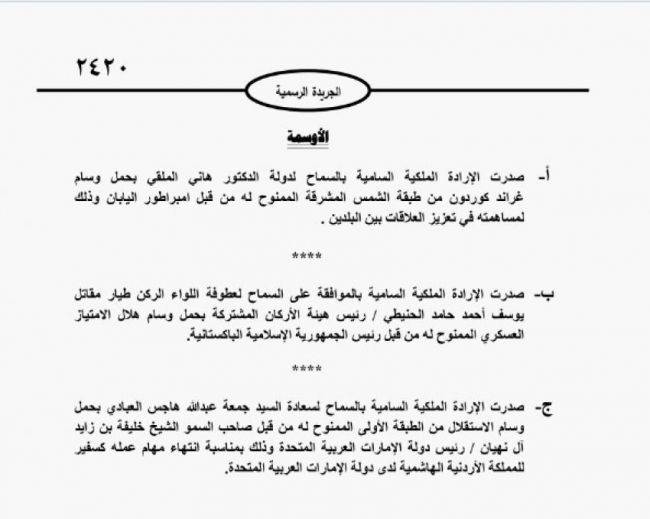 السماح للملقي والحنيطي والعبادي بحمل أوسمة دول خارجية