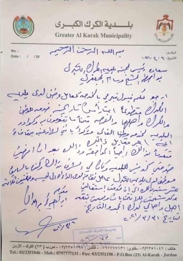 رئيس بلدية الكرك يطلب تعيينه عامل وطن دون مقابل