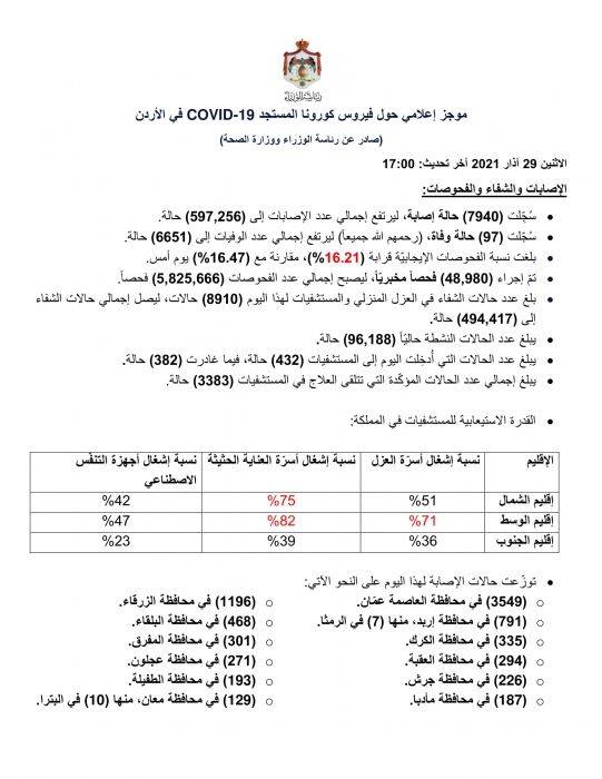 تسجيل 97 وفاة و 7940 اصابة بفيروس كورونا في الاردن
