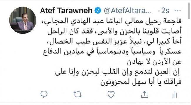 الصرايرة ينعى رئيس مجلس النواب الأسبق عبدالهادي المجالي