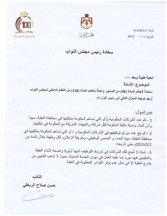 النائب الرياطي يسأل الخصاونة عن الشركات الحكومية في العقبة