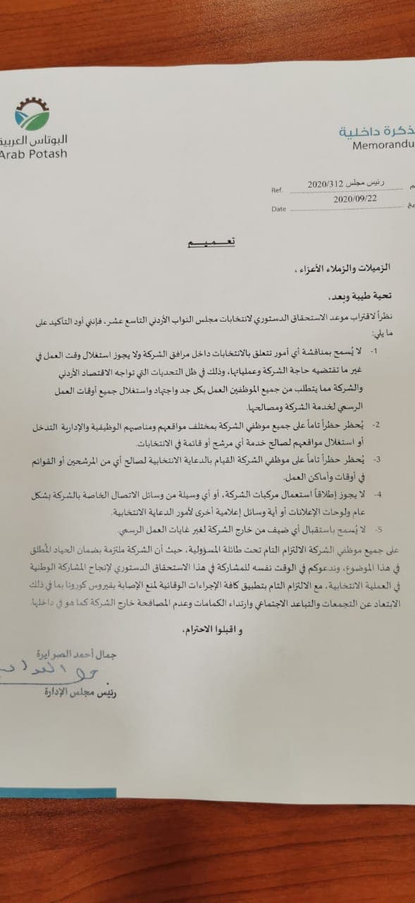 شركة البوتاس تحظر على موظفيها التدخل بالانتخابات المقبلة داخل مرافق الشركة