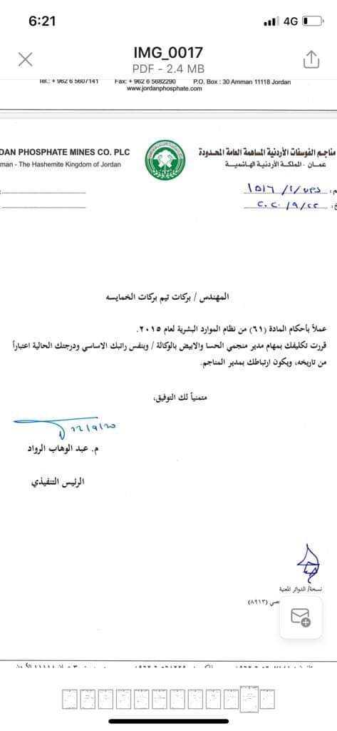 الرواد يسلم ادارة منجمي الحسا والابيض الى المهندس بركات تميم الخمايسة