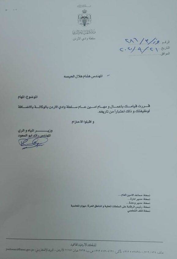 الحيصة امينا عاما لسلطة وادي الأردن بالوكالة