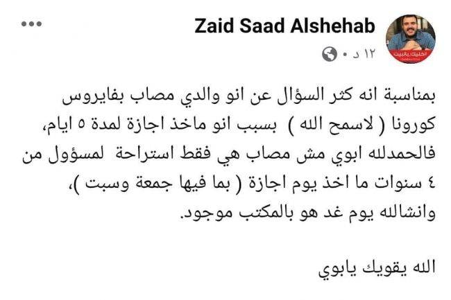 عاجل : نجل محافظ العاصمة سعد شهاب ينفي إصابة والده بفيروس كورونا المستجد