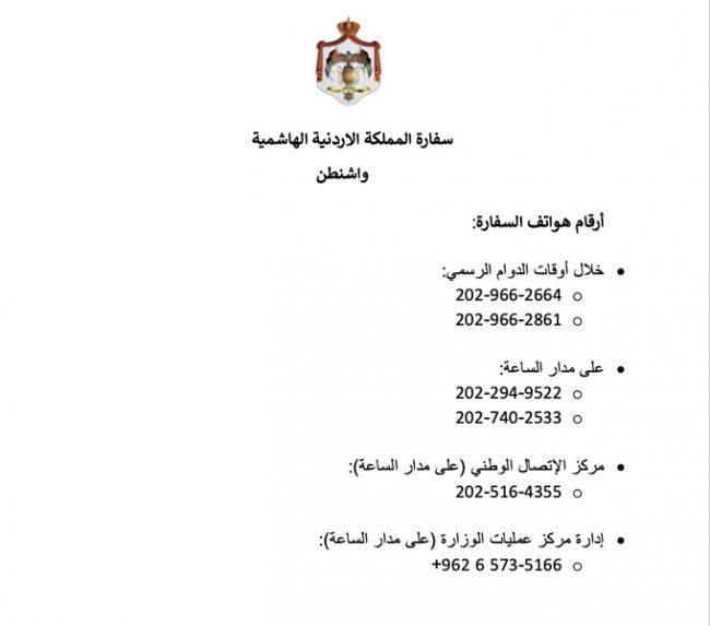 السفارة الأردنية في واشنطن تعلن ارقام الطوارئ