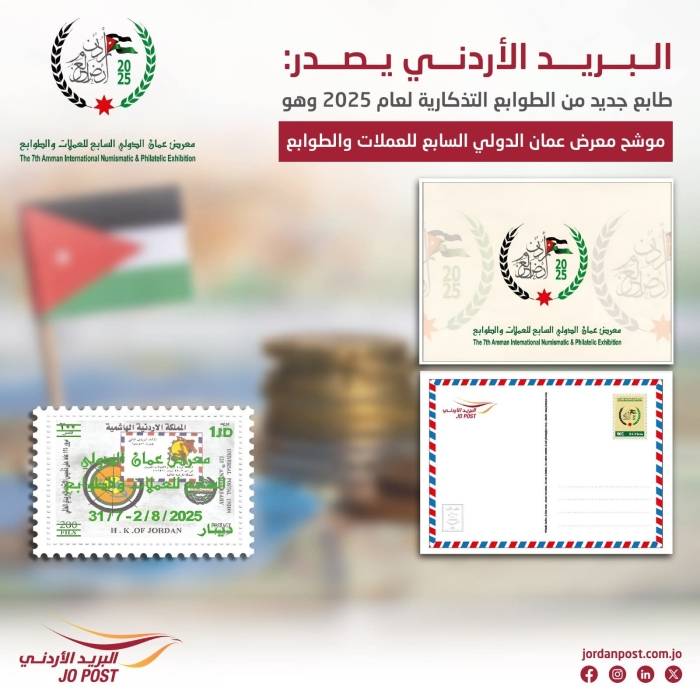البريد الأردني يطرح طوابع تذكارية بعنوان "موشح معرض عمان الدولي السابع للعملات والطوابع"