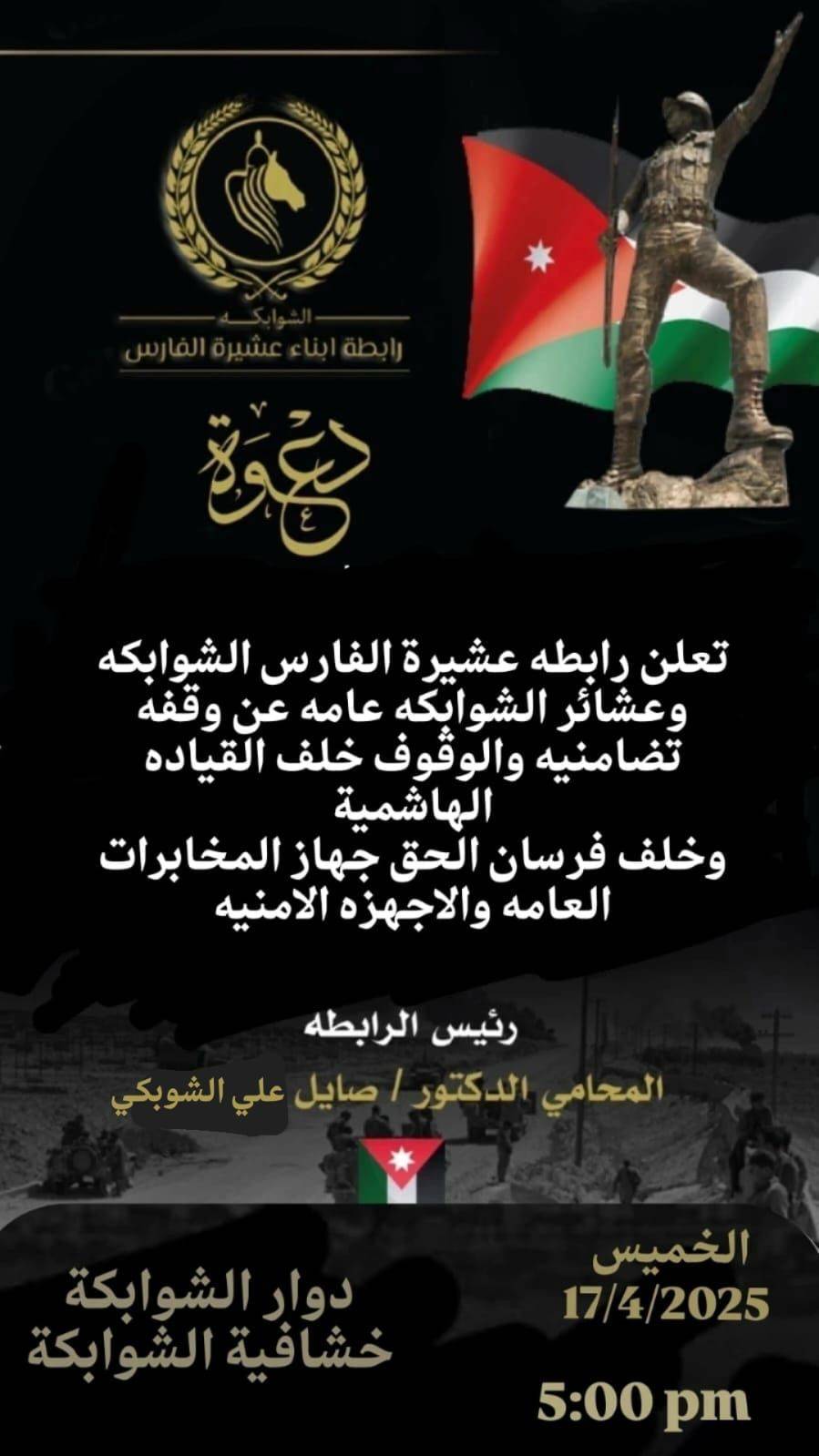تعلن رابطه عشيرة الفارس الشوابكه وعشائر الشوابكه عامه عن وقفه تضامنيه والوقوف خلف القياده الهاشميه
