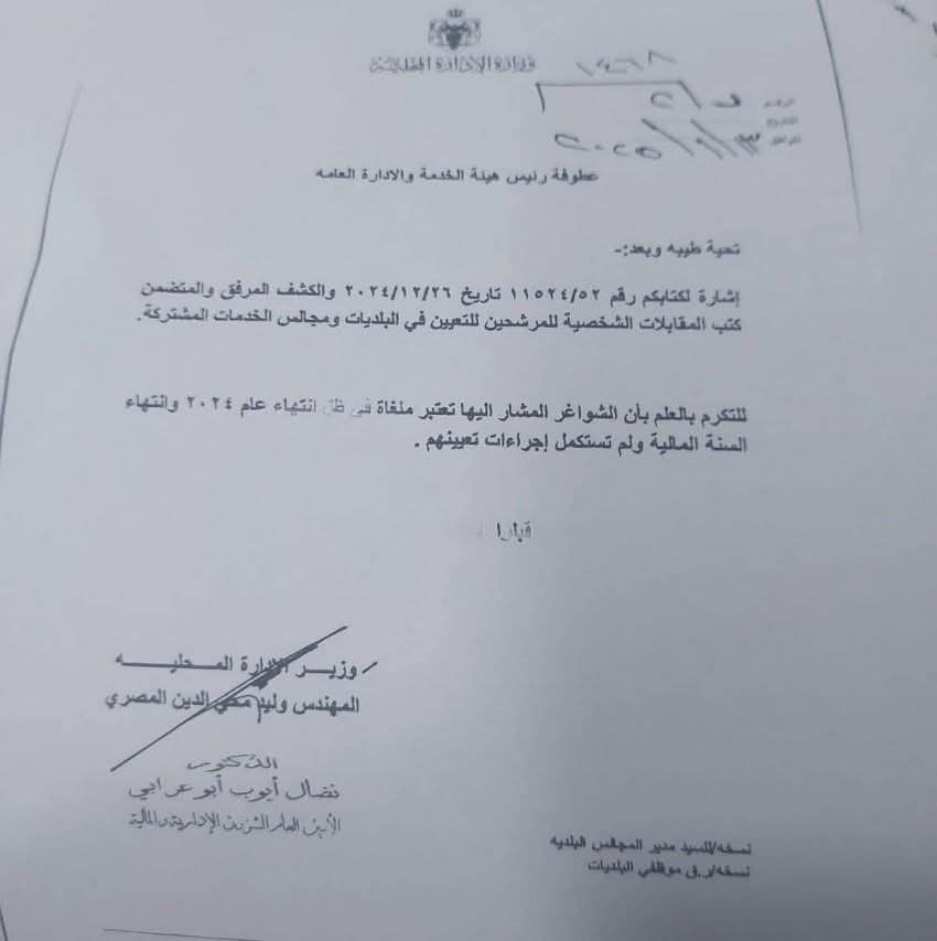 إلغاء المقابلات الشخصية للمرشحين للتعيين في البلديات ومجالس الخدمات المشتركة