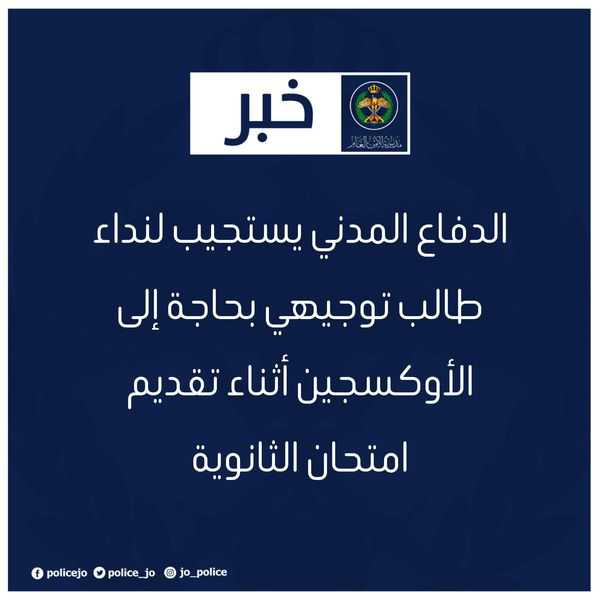 الدفاع المدني يستجيب لنداء طالب توجيهي بحاجة إلى الأوكسجين أثناء تقديم امتحان الثانوية