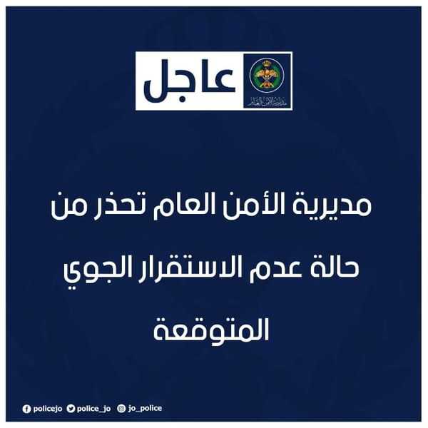 مديرية الأمن العام تحذر من حالة عدم الاستقرار الجوي المتوقعة