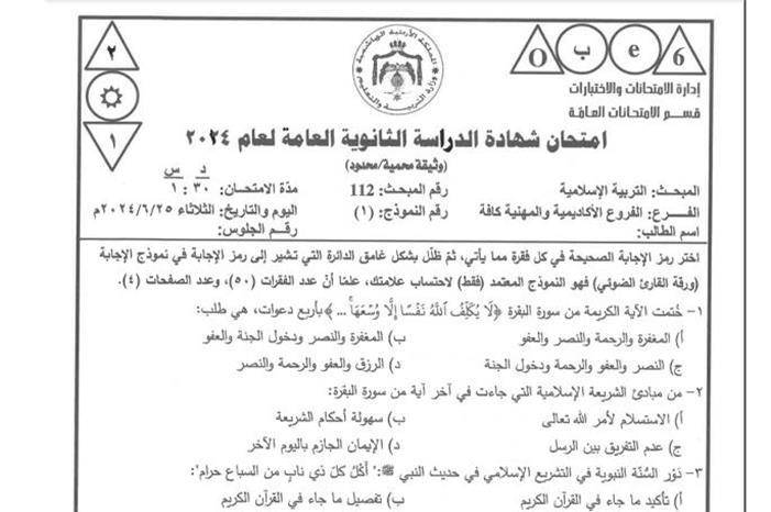 التربية تنشر أسئلة امتحان التربية الإسلامية للتوجيهي اليوم