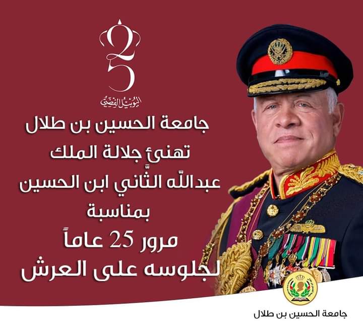 رئيس جامعة الحسين بن طلال يهنئ جلالة الملك بمناسبة عيد الجلوس الملكي الخامس والعشرين .