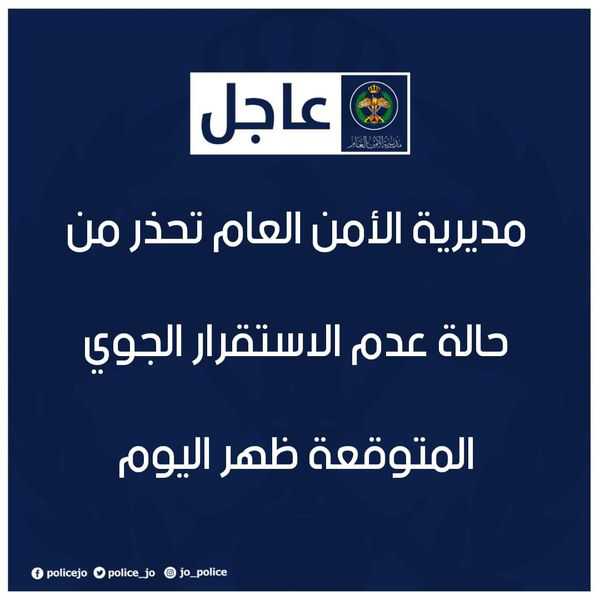 مديرية الأمن العام تحذر من حالة عدم الاستقرار الجوي المتوقعة ظهر اليوم