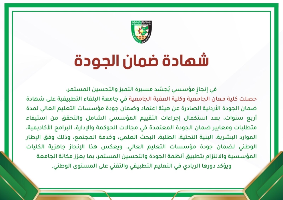 جامعة البلقاء التطبيقية تحصد شهادة ضمان الجودة الأردنية لكليتي معان والعقبة الجامعيتين لمدة أربع سنوات