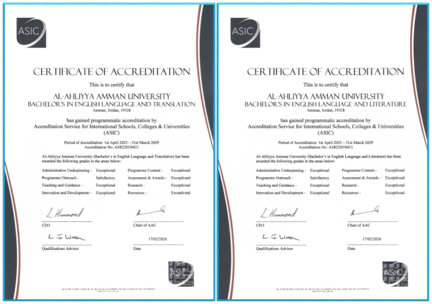 عمان الاهلية تحوز على الاعتماد البريطاني ASIC ببرنامجي اللغة الانجليزية "الآداب والترجمة " وفق أعلى مستوى