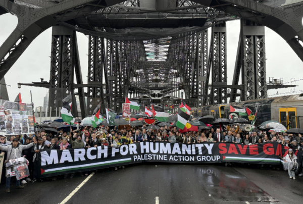 مسيرة حاشدة للتضامن مع غزة فوق جسر هاربور في سيدني