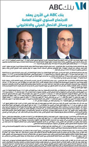 بنك ABC في الأردن يعقد الاجتماع السنوي للهيئة العامة عبر وسائل الاتصال المرئي والالكتروني