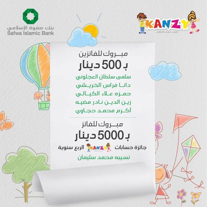 بنك صفوة الإسلامي يعلن الفائز بأول سحب ربع سنوي للعام 2023 والفائزين بسحب شهر آذار لحساب توفير الأطفال "كنزي