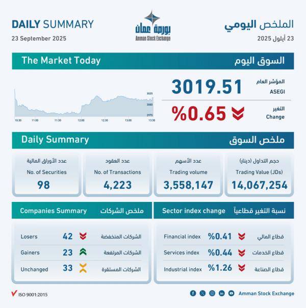 14.1 مليون دينار حجم التداول في بورصة عمان