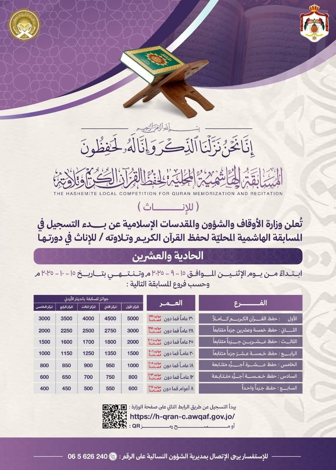 الأوقاف: بدء التسجيل للمسابقة الهاشمية للإناث لحفظ القران