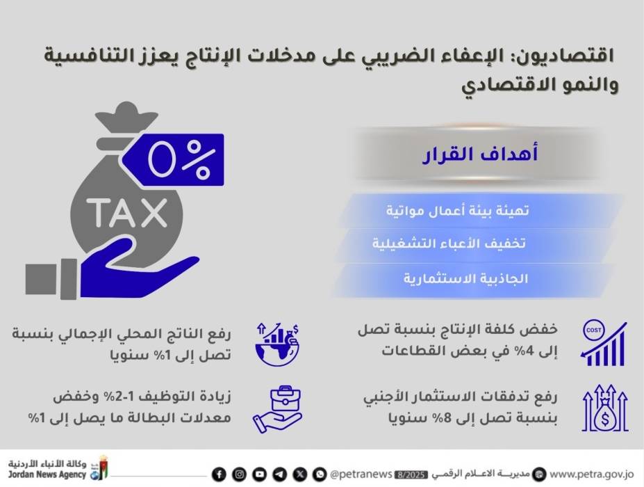 اقتصاديون: الإعفاء الضريبي على مدخلات الإنتاج يعزز التنافسية والنمو الاقتصادي