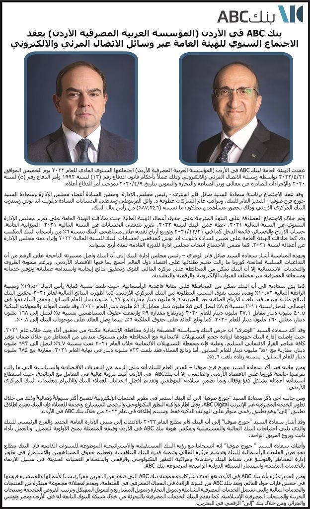 بنك ABC في الأردن (المؤسسة العربية المصرفية الأردن) يعقد الاجتماع السنوي للهيئة العامة عبر وسائل الاتصال المرئي والالكتروني