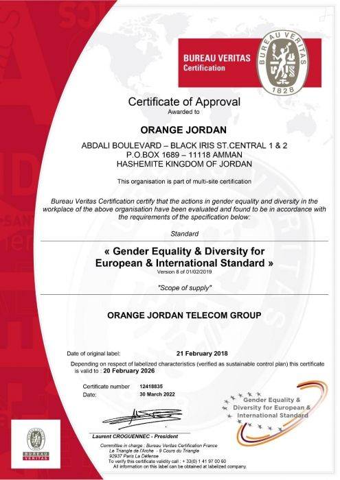 أورنج الأردن تحصل على شهادةGEEIS الدولية للمساواة بين الجنسين