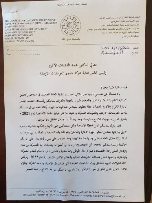 نقابة العاملين في المناجم والتعدين تؤكد رفضها تشويه الحقائق والاساءة لسمعة الفوسفات