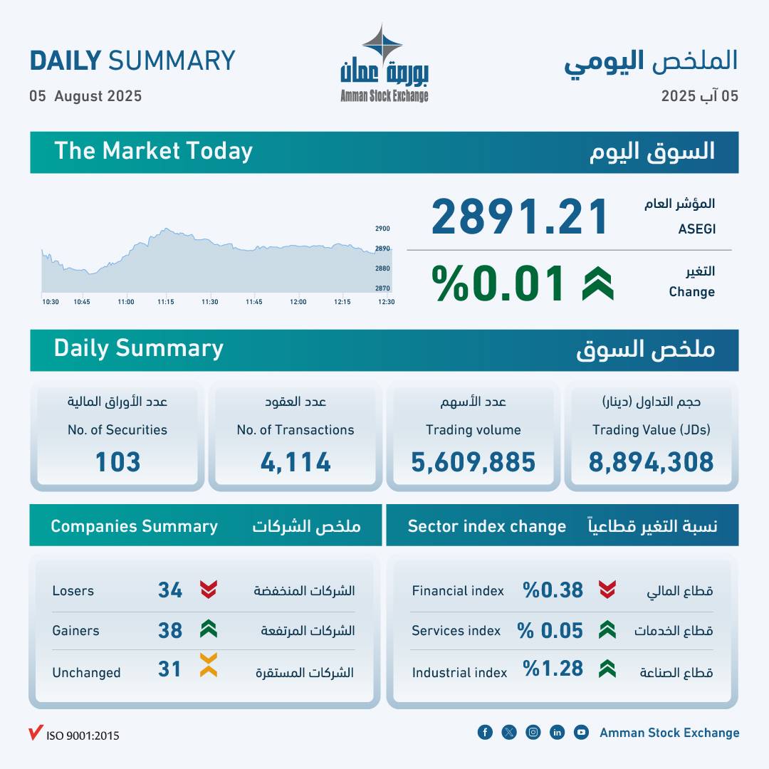 8.9 مليون دينار حجم التداول في بورصة عمان